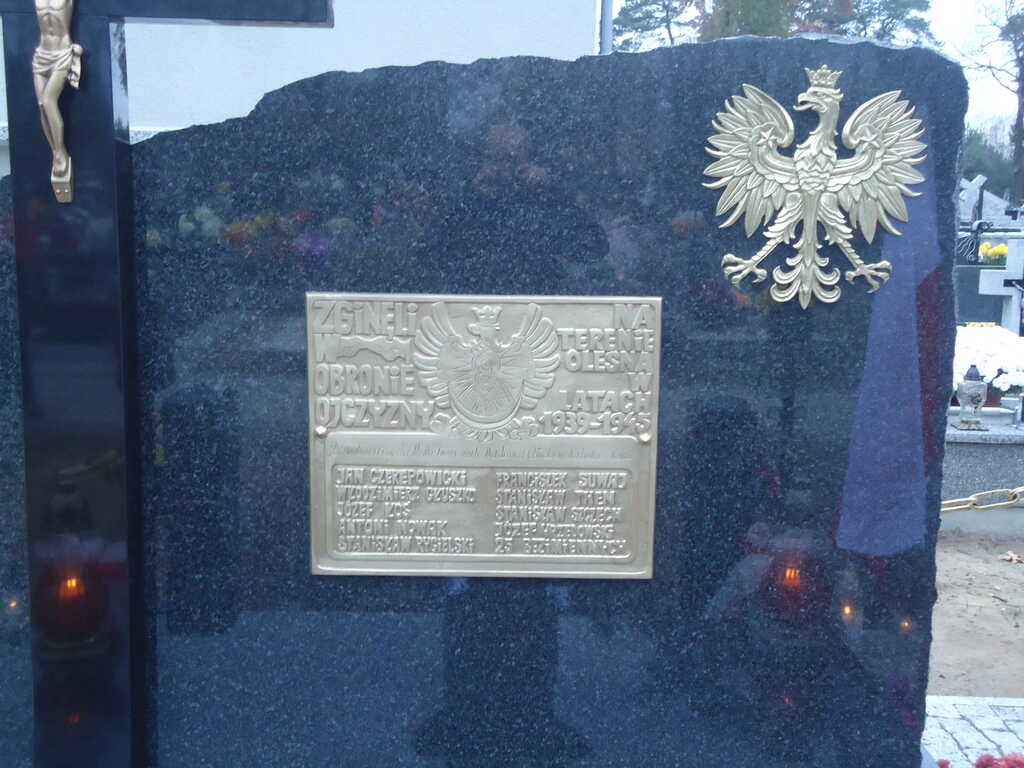 „ZGINĘLI/ W OBRONIE/ OJCZYZNY/ NA/ TERENIE/ OLESNA/ W/ LATACH/ 1939-1945/ JAN CZEREPOWICKI/ WŁODZIMIERZ GŁUSZKO/ JÓZEF ŁOŚ/ ANTONI NOWAK/ STANISŁAW RYGIELSKI/ FRANCISZEK SUWAJ/ STANISŁAW THEN/ STANISŁAW SZCZĘCH/ JÓZEF URZĘDOWSKI/ 25 BEZIMIENNYCH”.
