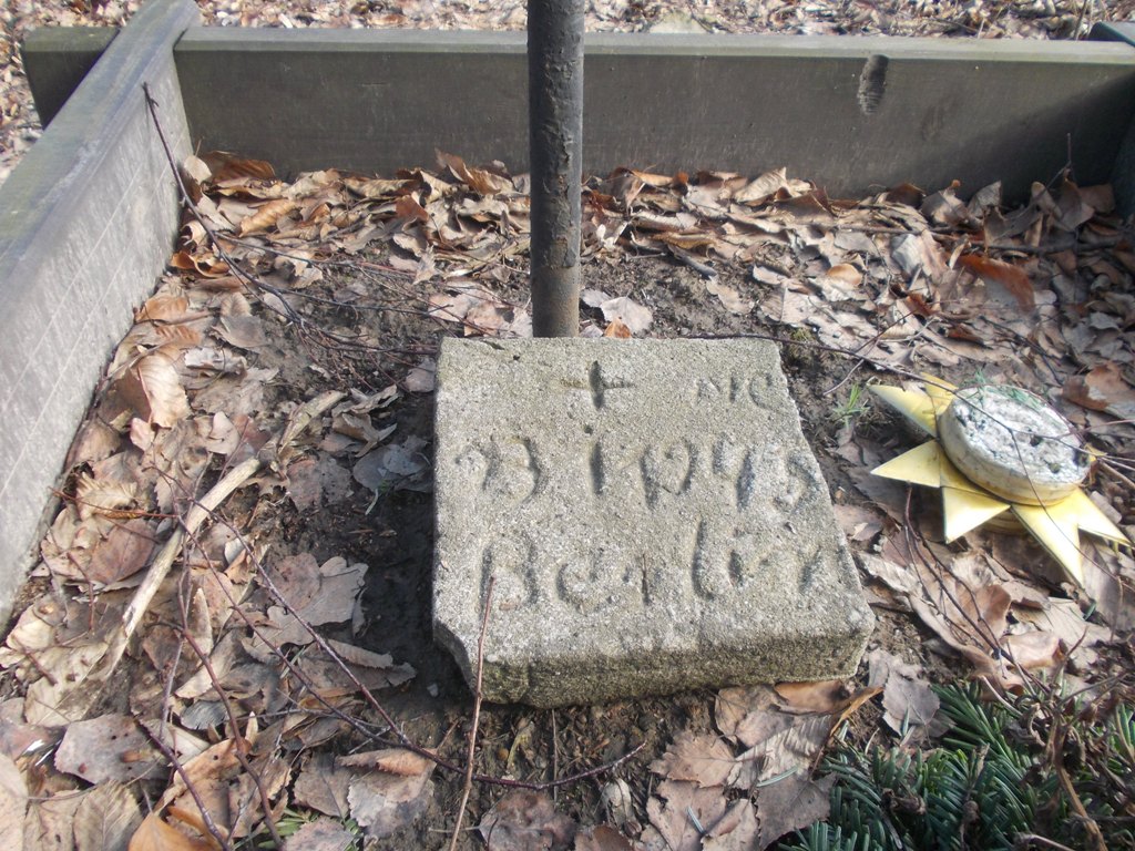 Mogiła ziemna, obramowana deskami, u wezgłowia krzyż z metalowych rur i niewielka betonowa płyta z wyrytymi datą „23 I 1945” i napisem „Berlin”.