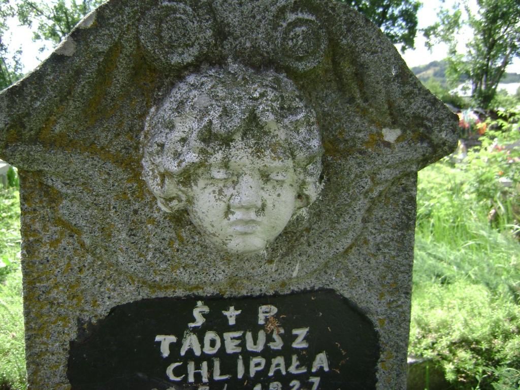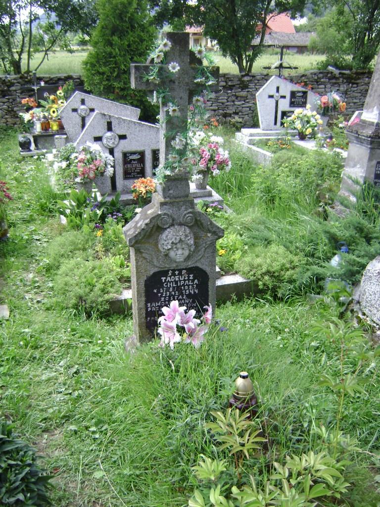 Mogiła ziemna, u wezgłowia pomnik w formie wysokiego postumentu zwieńczonego krzyżem łacińskim z motywem koła spinającego ramiona. Na licu postumentu umieszczona jest płaskorzeźba przedstawiająca głowę aniołka ze skrzydłami oraz kamienna tablica z napisem: „چP/ TADEUSZ/ CHLIPAŁA/ *21 3 1927/ + 23 12 1944/ ZOSTAŁ/ ZAMORDOWANY/ PRZEZ ZBIRÓW/ NIEMIECKICH/ PROSI O WESTCHNIENIE/ DO BOGA/ NAJDROŻSZEMU/ SYNOWI RODZICE".