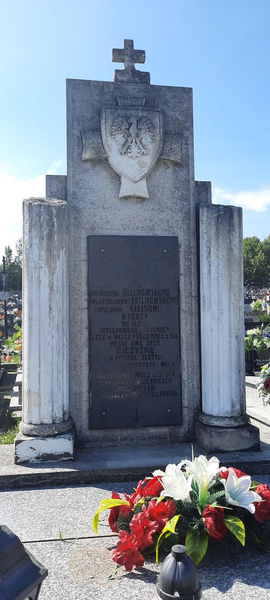 Betonowy nagrobek zwężający się ku górze schodkowo, nakryty granitowymi płytami. U wezgłowia ściana pomnikowa zwieńczona małym krzyżem, flankowana dwiema kolumnami. W górnej części ściany znajduje się płaskorzeźba przedstawiająca krzyż maltański z datami „1939" i „1945" oraz hasłem „WOLNOŚĆ" na belkach. Na krzyż nałożona jest tarcza z wizerunkiem orła bez korony. Niżej na licu pomnik umieszczona jest tablica z ciemnego kamienia z napisem: „ŻOŁNIERZOM/ ARMII KRAJOWEJ/ Ś.†P./ ANTONIEMU KOTLINOWSKIEMU/ WŁADYSŁAWOWI KOTLINOWSKIEMU/ LEOPOLDOWI KARASIOWI/ KTÓRZY NIE ULEGLI/ HITLEROWSKIEJ PRZEMOCY/ LECZ W WALCE PODZIEMNEJ Z NIĄ/ MŁODE SWE ŻYCIE/ OJCZYŹNIE/ W OFIERZE/ ZŁOŻYLI/ TOWARZYSZE WALK./ ARESZTOWANI PRZEZ GESTAPO 3.VII.1944 W RACŁAWICACH/ ROZSTRZELANI 24.VII.1944 R. W IWONICZU k. KROSNA."