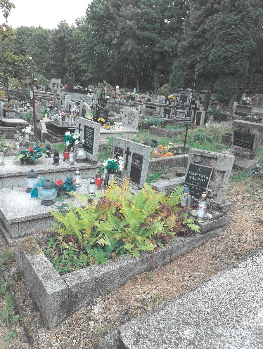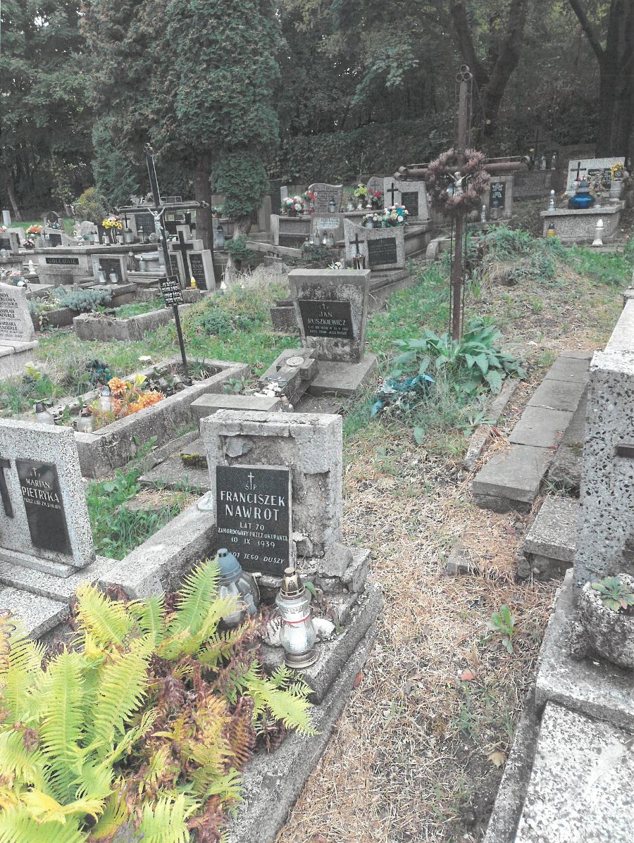 Grób ziemny w betonowym obramowaniu, uszkodzona betonowa attyka z kamienną tablicą z inskrypcją „Ś.†P./ FRANCISZEK NAWROT/ LAT 70/ ZAMORDOWANY PRZEZ OKUPANTA/ 10 IX 1939/ POKÓJ JEGO DUSZY”.