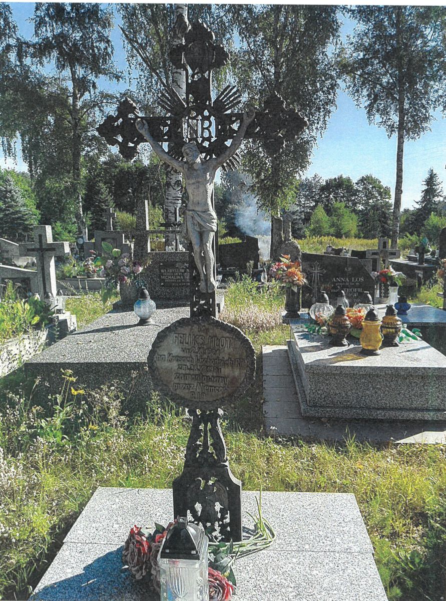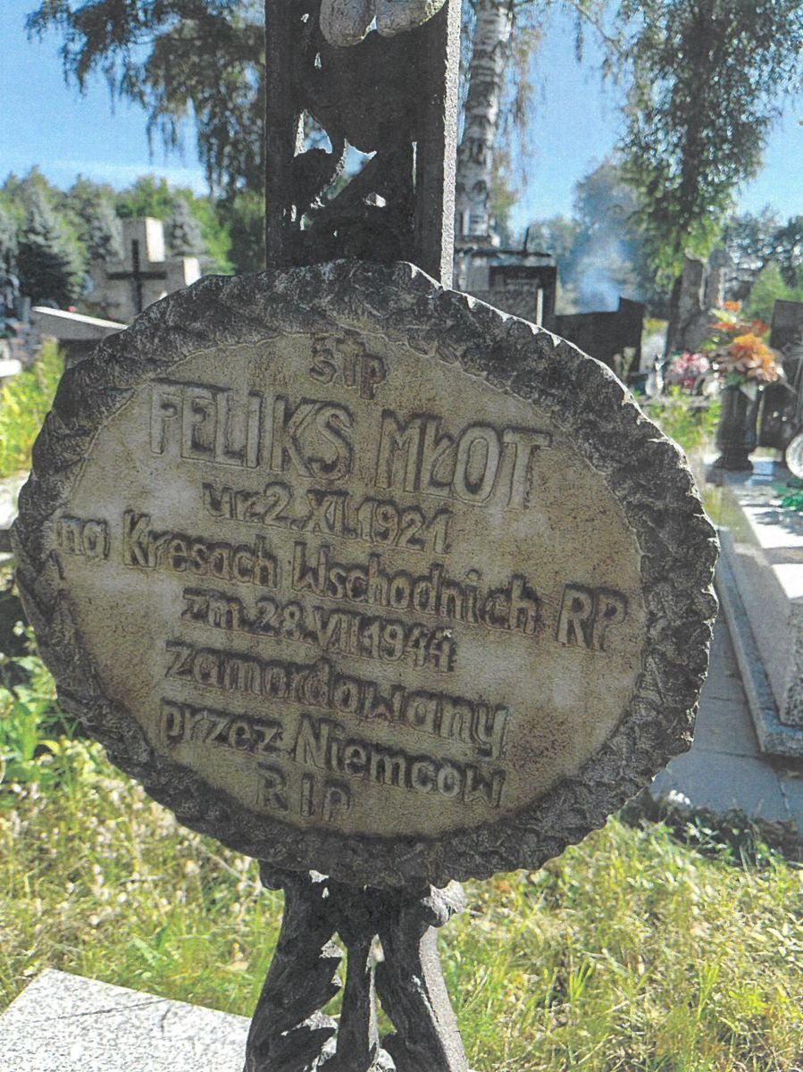 „چP/ FELIKS MŁOT/ ur. 2.XI.1921/ na Kresach Wschodnich RP/ zm. 28.VII.1944/ zamordowany/ przez Niemców/ R I P”.