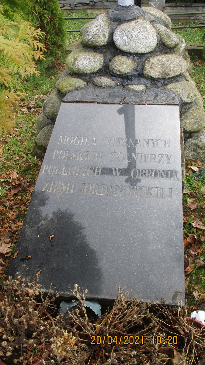 Płyta z ciemnego kamienia z inskrypcją „MOGIŁA NIEZNANYCH/ POLSKICH ŻOŁNIERZY/ POLEGŁYCH W OBRONIE/ ZIEMI JORDANOWSKIEJ" na ściętej pulpitowo granitowej podstawie, przed którą umieszczono zrekonstruowaną w 2022 r. czapkę legionową. U wezgłowia nagrobka znajduje się kopiec kamienny zwieńczony metalowym krzyżem. Mogiła otoczona jest ogrodzeniem z metalowych słupków, połączonych parami prętów i łańcuchem. Od strony frontowej wejście zamknięte jest plakiet z metalu przedstawiającego orła trzymającego w szponach dwa miecze.