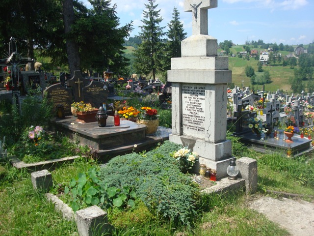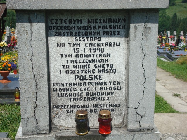 „CZTEREM NIEZNANYM/ OFICEROM WOJSK POLSKICH/ ZASTRZELONYM PRZEZ GESTAPO NA TYM CMENTARZU/ 15 I 1940/ TYM BOHATEROM/ I MĘCZENNIKOM/ ZA WIARĘ ŚWIĘTĄ/ I OJCZYZNĘ NASZĄ/ POLSKE/ POSTAWIŁA POMNIK TEN W DOWÓD CZCI I MIŁOŚCI/ LUDNOŚĆ BUKOWINY/ TATRZAŃSKIEJ