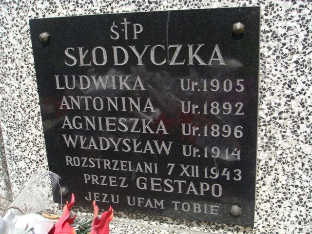 „Ś † P / SŁODYCZKA / LUDWIKA Ur. 1905 / ANTONINA Ur. 1892 / AGNIESZKA Ur. 1896 / WŁADYSŁAW Ur. 1914 / ROZSTRZELANI 7 XII 1943 / PRZEZ GESTAPO / JEZU UFAM TOBIE”