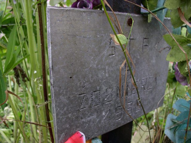 Mogiła ziemna z metalowym krzyżem i tabliczką z napisem: „چP 4 żołnierzy”.