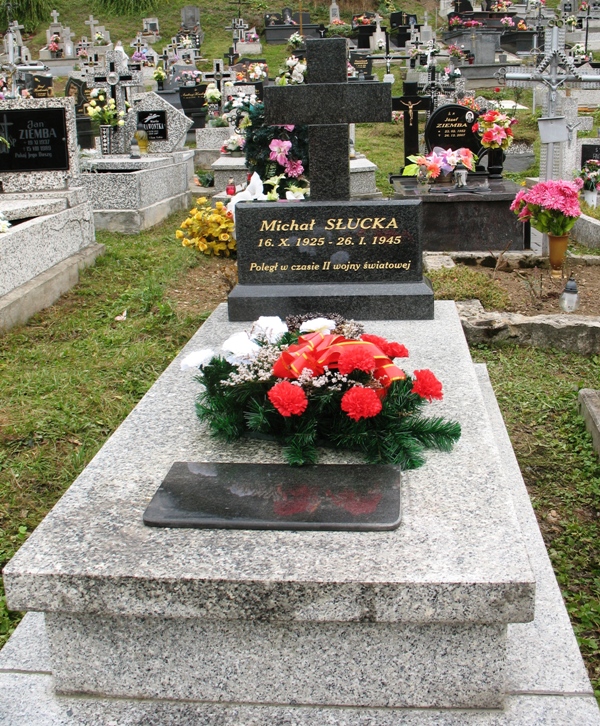 Mogiła obramowana i nakryta lastrykową płytą. U wezgłowia znajduje się kamienny pomnik w kształcie krzyża łacińskiego z napisem: „Michał SŁUCKA, 16.X.1925 - 26.I.1945/ Poległ w czasie II wojny światowej". Pochowano tu Michała Słuckę, prawdopodobnie narodowości słowackiej, zastrzelonego w 1945 r.