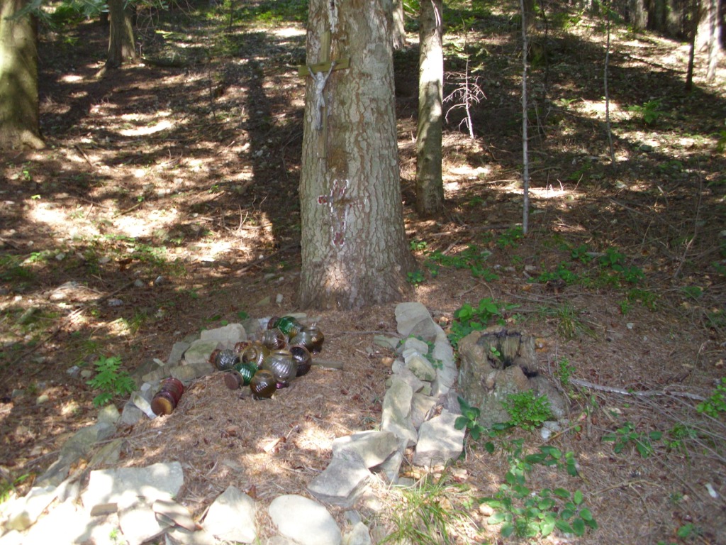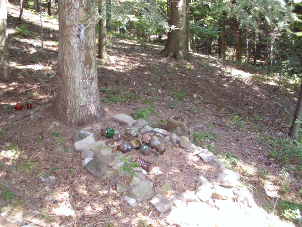 Mogiła ziemna, obłożona kamieniami, znajdująca pod drzewem, do którego przybity jest drewniany krzyż z figurą Chrystusa. Pochowano tu nieznanego partyzanta rozstrzelanego w 1943 r.