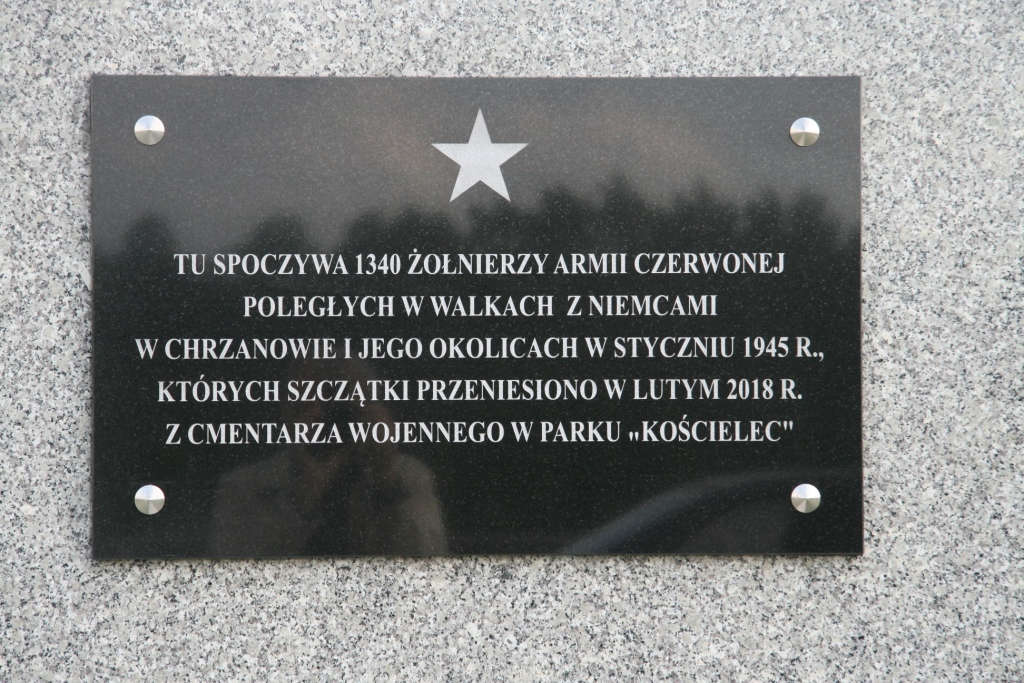 TU SPOCZYWA 1340 ŻOŁNIERZY ARMII CZERWONEJ/ POLEGŁYCH W WALKACH Z NIEMCAMI/ W CHRZANOWIE I JEGO OKOLICACH W STYCZNIU 1945 R./ KTÓRYCH SZCZĄTKI PRZENIESIONO W LUTYM 2018 R./ Z CMENTARZ WOJENNEGO W PARKU "KOŚCIELEC"