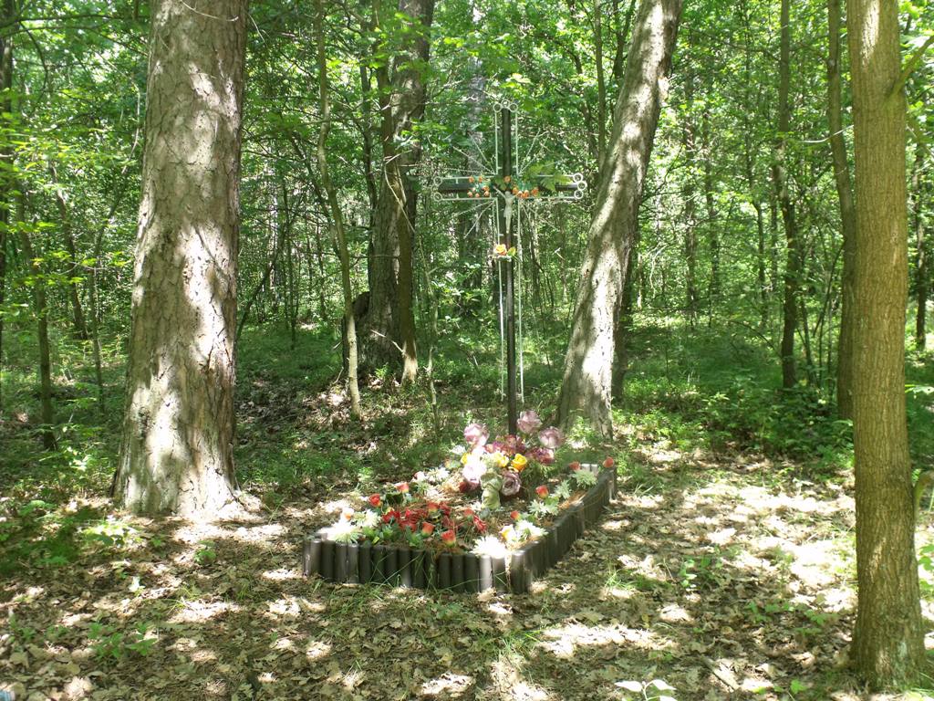 Mogiła ziemna obramowana palikami, u wezgłowia krzyż z metalowych rur, pomalowanych na czarno, ze zdobieniami w formie okalających ramiona metalowych prętów, pomalowanych białą farbą oraz pasyjką.