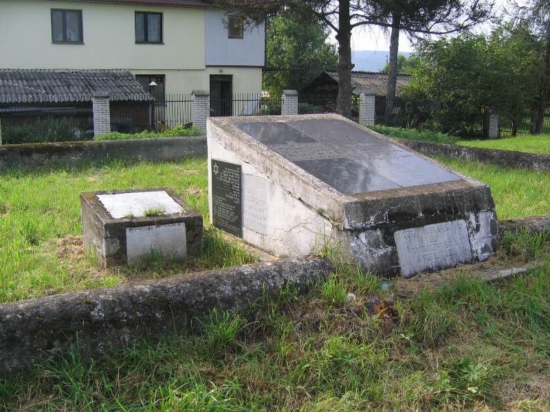 – tablica z ciemnego kamienia z napisem: „W TYM MIEJSCU LEŻĄ/ MOI NAJBLIŻSI/ ZASTRZELENI PRZEZ GESTAPOWCÓW/ W DNIU 29 KWIETNIA 1942 ROKU/ ojciec KANENGISER JAKUB- ur. 1900/ mama – KANENGISTER ITTA LUSTIG  -ur. 1890/ siostra KANENGISER RACHELA – ur. 1926/ brat – KANENGISER MOSZE – ur. 1930/ NA WIECZNĄ PAMIĘĆ/ od syna MORDECHAJA KANENGISER-LUSTIG/ jedynego ocalałego członka z całej rodzinny”