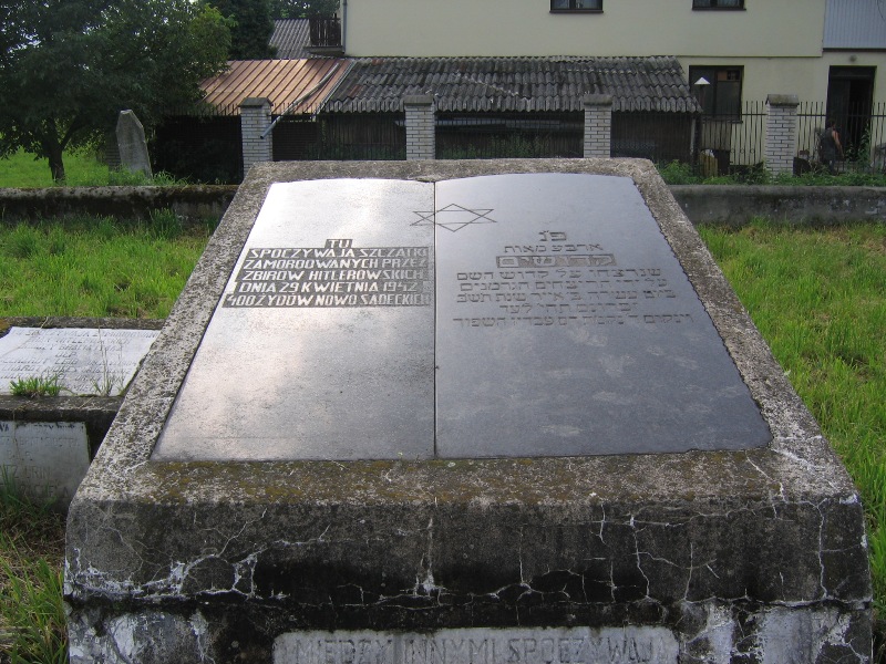 – tablica z ciemnego kamienia tu spoczywają: „TU/ SPOCZYWAJĄ SZCZĄTKI/ ZAMORDOWANYCH PRZEZ/ ZBIRÓW HITLEROWSKICH/ DNIA 29 KWIETNIA 1942/ 400 ŻYDÓW NOWOSĄDECKICH”.