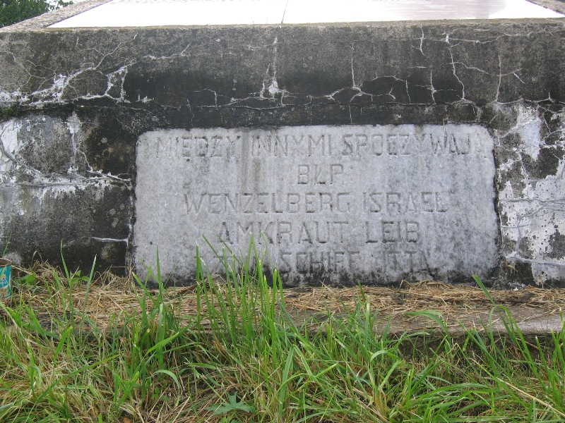 – tablica z jasnego kamienia z napisem „MIĘDZY INNYMI SPOCZYWAJĄ/ BŁP./ WENZELBERG ISRAEL/ AMKRAUT LEIB/ i ŻONA SCHIFF ITTA”