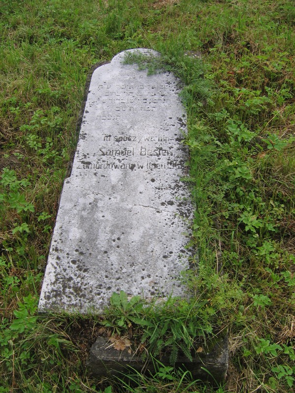 Betonowy nagrobek nakryty płytą z jasnego kamienia z napisami w języku hebrajskim i polskim: „Tu spoczywa błp./ Samuel Besler/ Zamordowany w lipcu 1942 r.”