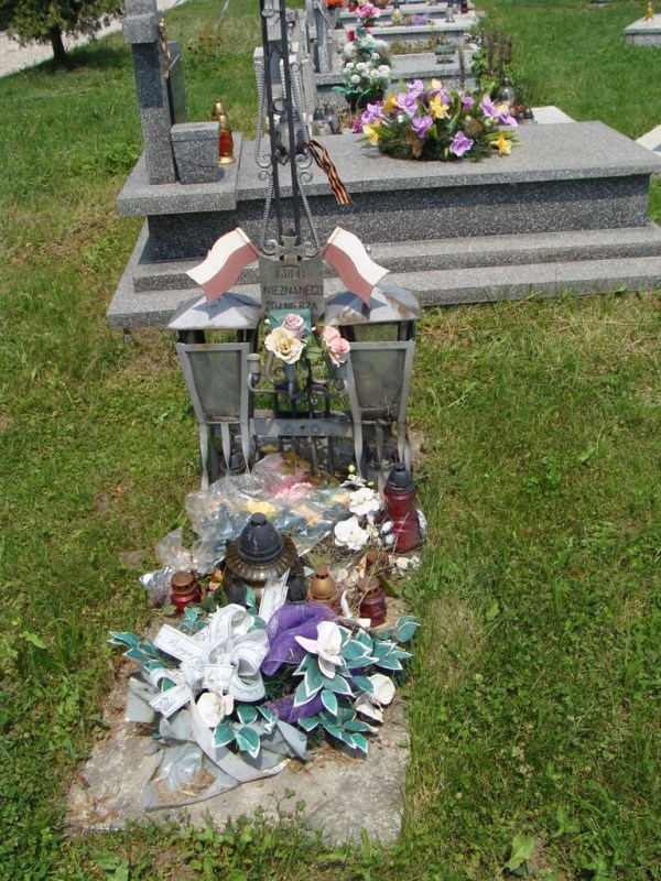 Mogiła nakryta betonową płytą, u wezgłowia ażurowy metalowy krzyż łaciński z pasyjką i promienistą glorią. W dolnej części krzyża znajduje się metalowa tabliczka z napisem: „GRÓB NIEZNANEGO ŻOŁNIERZA”. Do tabliczki przymocowany jest metalowy krzyż maltański z wyrytymi datami: „1939-1945”. Po obu stronach tabliczki umieszczone są biało-czerwone chorągiewki. U podstawy krzyża znajdują się dwa pojemniki na znicze.