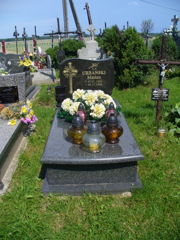 Nagrobek z ciemnego kamienia. U wezgłowia stela o falistych krawędziach. Na steli wyryty jest krzyż oraz napis: „Ś.P./ URBAŃSKI/ MARIAN/ * 05.01.1926/ † 08.11.1944”