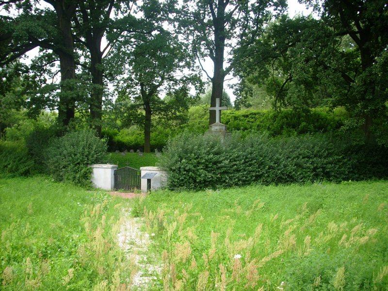 Cmentarz założony jest na planie zbliżonym do prostokąta z trójkątnym wyłomem od strony frontowej. Ogrodzenie stanowią betonowe słupy z nakrywą, połączone żywopłotem. Znajdujące się od strony południowej wejście zamykane jest dwuskrzydłowymi, metalowymi wrotami, zwieńczonymi krzyżem łacińskim. Po obu stronach wejścia znajdują się krótkie odcinki muru z betonową nakrywą. Główny element cmentarza stanowi pomnik w formie betonowego krzyża na wysokim, trójstopniowym postumencie. Na frontowej ścianie postumentu umieszczona jest tablica z wyrytym krzyżem maltańskim oraz napisem „1914-1915/ GETREU IN NOT-/ SELIG IM TOD”.