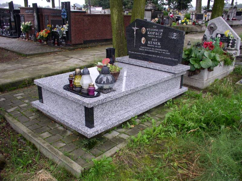 Na mogile znajduje się nagrobek wykonany z jasnego granitu. U wezgłowia mogiły umieszczona jest stela w kształcie niesymetrycznego pięcioboku. Na licu steli znajdują się: metalowy krzyż z figurą Chrystusa, dwa owalne medaliony z fotografiami pochowanych, symbol „Polski Walczącej” oraz napis „Ś.P./ STANISŁAW KOPACZ/ PRZEŻYŁ 49 LAT/ JAN KUSEK/ PRZEŻYŁ 48 LAT/ PARTYZANCI AK ZAMORDOWANI/ PRZEZ HITLEROWCÓW dn. 7.09.1944/ Boże spraw – aby owocem ofiary życia naszych Ojców była wolna, sprawiedliwa Ojczyzna”.