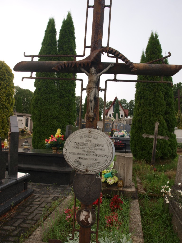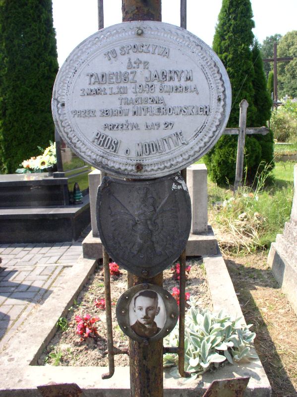 Mogiła ziemna w betonowym obramowaniu. U wezgłowia mogiły na betonowej podstawie znajduje się krzyż z metalowych rur z pasyjką, nad którą umieszczone jest zadaszenie z ząbkowanej blachy. Do dolnego drzewca krzyża przymocowane są ryngraf z wyobrażeniem Matki Boskiej i orła w koronie, fotografia zmarłego w metalowej ramce oraz owalna, metalowa tabliczka z napisem: „TU SPOCZYWA/ Ś.†P./ TADEUSZ JACHYM/ ZMARŁ 1.XII.1943 ŚMIERCIĄ/ TRAGICZNĄ/ PRZEZ ZBIRÓW HITLEROWSKICH/ PRZEŻYŁ LAT 27/ PROSI o MODLITWĘ”.