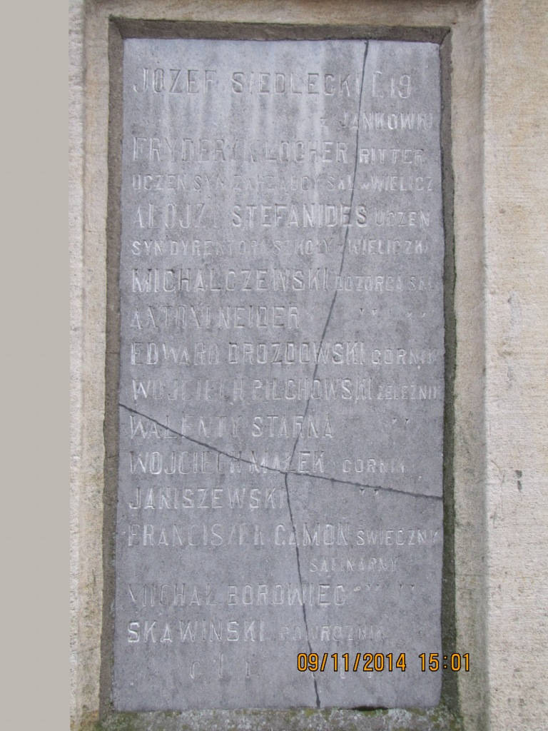 – „JÓZEF SIEDLECKI L. 19/ Z JANKÓWKI/ FRYDERYK LOCHER RITTER/ SYN ZARZĄDCY SAL. w WIELICZ/ ALOJZY STEFANIDES UCZEŃ/ SYN DYREKTORA SZKOŁY z WIELICZKI/ MICHALCZEWSKI DOZORCA SAL/ ANTONI NEIDER/ EDWARD DROZDOWSKI GÓRNIK/ WOJCIECH PILCHOWSKI ŻELEŹNIK/ WALENTY STARNA/ WOJCIECH MAŁEK GÓRNIK/ JANISZEWSKI/ FRANCISZEK CAMON ŚWIECZNY/ SALINARNY/ MICHAŁ BOROWIEC/ SKAWIŃSKI/ POWROŹNIK/ c t r. c t r."
