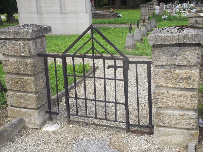 – betonowego krzyża lotaryńskiego z żeliwnym, ażurowym krzyżem lotaryńskim na licu, osadzonego na betonowym cokole z owalną, emaliowaną tabliczką z informacją o pochowanych,