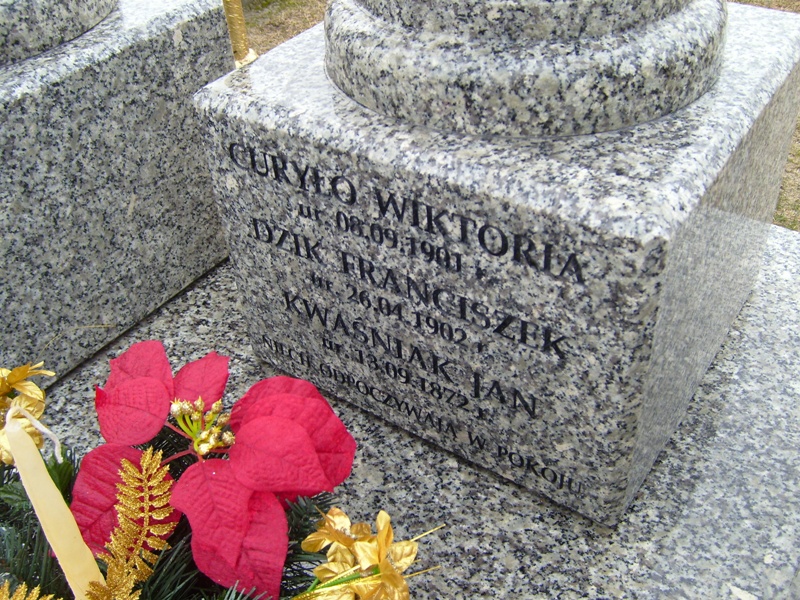 – „CURYŁO WIKTORIA/ ur. 08.09.1901 r./ DZIK FRANCISZEK/ ur. 26.04.1902 r./ KWAŚNIAK JAN/ ur. 13.09.1872 r./ NIECH ODPOCZYWAJĄ W POKOJU” (środkowa kolumna),