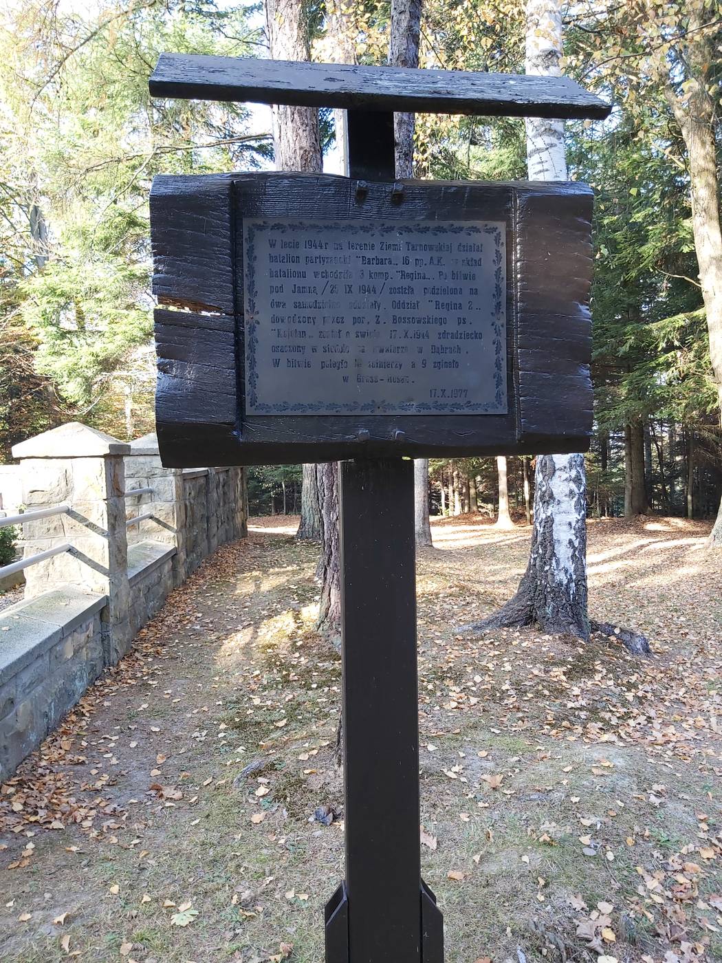 – „PARTYZANTOM ARMII KRAJOWEJ/ ODDZ. REGINA II POLEGŁYM 17 X 1944/ W WALCE Z HITLEROWSKIM NAJEŹDŹCĄ/ O WOLNOŚĆ OJCZYZNY/ MJR BOSSOWSKI ZDZISŁAW ●KAJETAN●/ KPT. ŁUCZKIEWICZ LEON ●KRAJEWSKI●/ POR ŁUCZKIEWICZ MARIAN ●KRUK I●/ PCHR. ROZWADOWSKI BRONISŁAW ●DYNAMIT●/ PCHR. BORYCZKO JÓZEF ●DĄB●/ ST.STRZ. DURAN IGNACY ●PIOŁUN●/ ST. STRZ. BORYCZKO WŁADYSŁAW ●LIŚĆ●/ ST.STRZ. RUBIN FRANCISZEK ●MURZYN II”/ STRZ. DZIADYK JANUARY ●CZERNY●/ STRZ. JEDLECKI JAN ●BATORY●/ STRZ. JĘDRZEJOWSKI ADOLF ●TARZAN III●/ STRZ. MAGDZIŃSKI WŁADYSŁAW/ STRZ. MLECZKO ANTONI ●MOKRZYCKI●/ STRZ. ŁYCZKO MARIAN ●TWARDOWSKI●/ STRZ. PODKÓWKA JÓZEF ●SKOBEL●/ STRZ. WADAS JAN ●SZTACHETA●/ STRZ. WALCZYK ANDRZEJ ●KRUK II●/ STRZ. ŻURAWSKI JAN ●ŻURAW●/ SPOŁECZEŃSTWO POWIATU/ GORLICKIEGO”