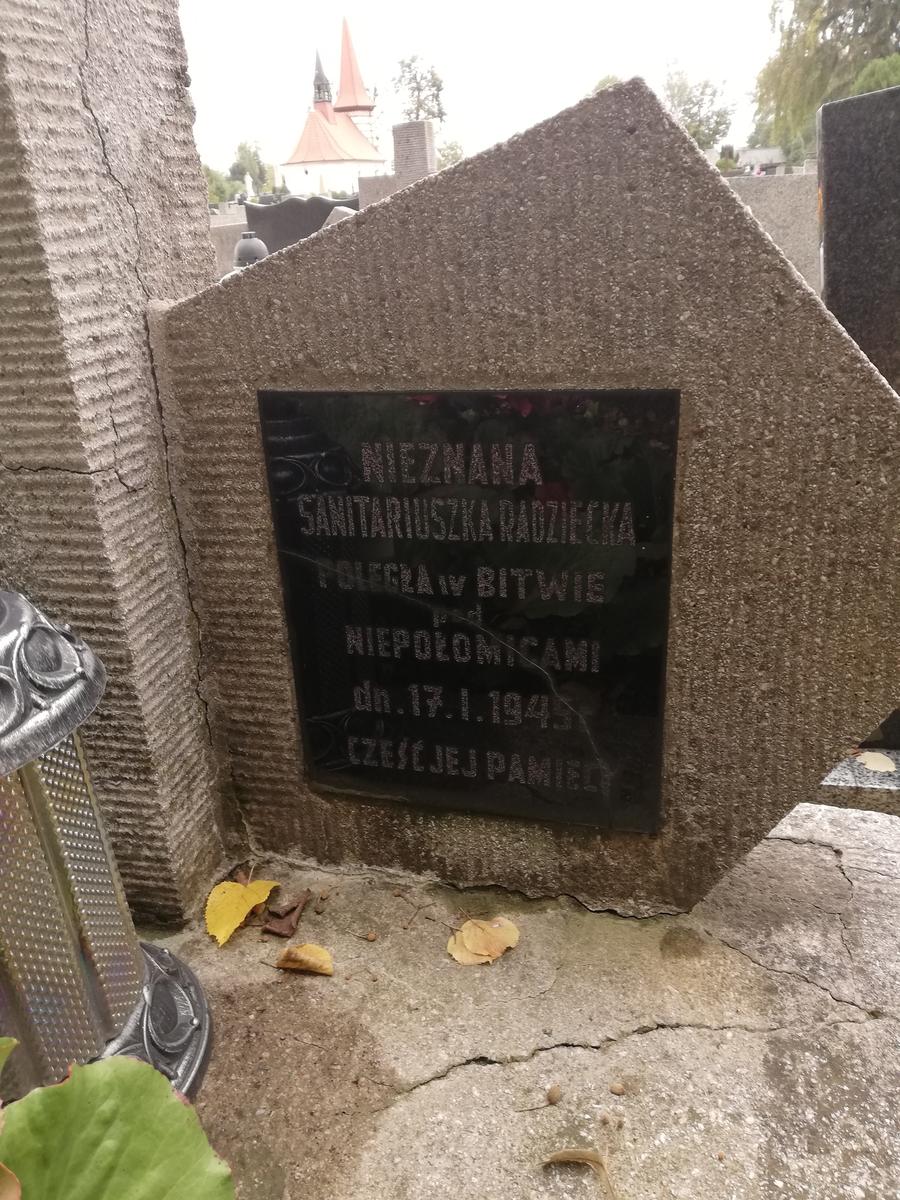 – „NIEZNANA/ SANITARIUSZKA RADZIECKA/ POLEGŁA w BITWIE/ pod NIEPOŁOMICAMI/ dn. 17.I.1945/ CZEŚĆ JEJ PAMIĘCI" (tablica po prawej stronie).