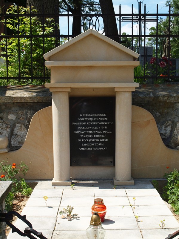 Mogiła założona jest na planie prostokąta i przylega z jednej strony do muru cmentarnego, z pozostałych stron ogrodzona jest niskim murkiem i słupami z wapiennych bloczków z płaską, betonową nakrywą, połączonymi żelaznymi łańcuchami. U wezgłowia mogiły znajduje się pomnik w stylu klasycystycznym w formie kapliczki z dwoma kolumnami i dwuspadowym daszkiem. Na frontowej ścianie umieszczona jest prostokątna tablica z ciemnego kamienia z napisem: „W TEJ STAREJ MOGILE/ SPOCZYWAJĄ ŻOŁNIERZE/ POWSTANIA KOŚCIUSZKOWSKIEGO/ POLEGLI W MAJU 1794 R./ BRONIĄCY WAROWNEGO OBOZU/ W MIEJSCU KTÓREGO/ NA POCZĄTKU XIX WIEKU/ ZAŁOŻONY ZOSTAŁ/ CMENTARZ PARAFIALNY”. Fragment mogiły przed pomnikiem, wyłożony jest prostokątnymi płytami.