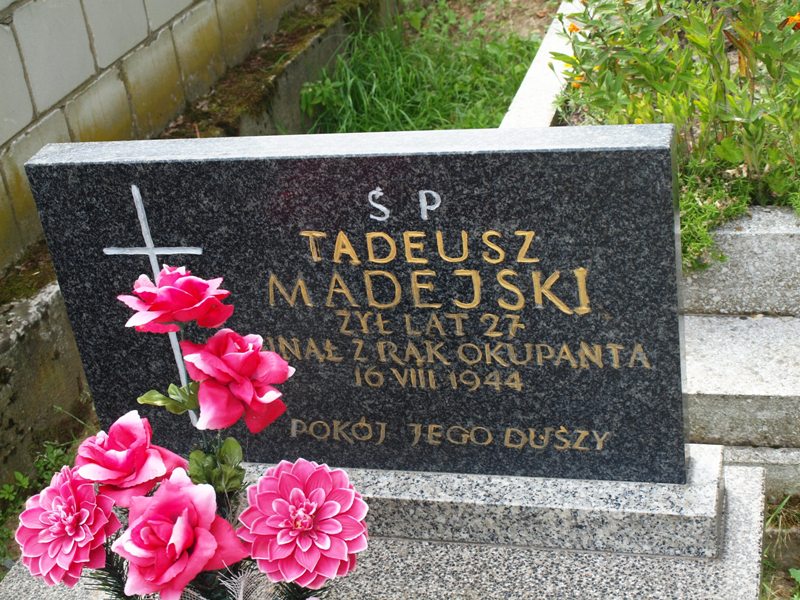 Mogiła obramowana i nakryta lastrykową płytą. U wezgłowia mogiły znajduje się prostokątna, kamienna stela z wyrytym krzyżem łacińskim i napisem: „Ś P/ TADEUSZ/ MADEJSKI/ ŻYŁ LAT 27/ ZGINĄŁ Z RĄK OKUPANTA/ 16 VIII 1944/ POKÓJ JEGO DUSZY”.