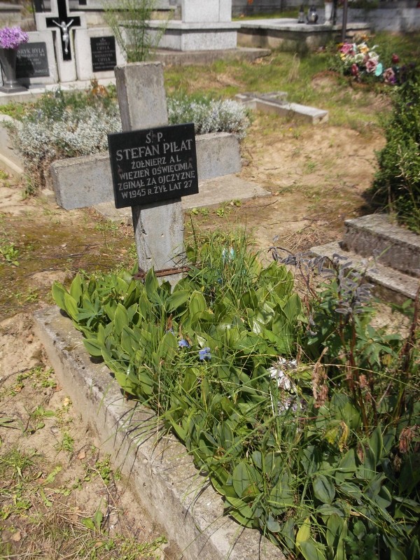 Mogiła ziemna w betonowym obramowaniu, u wezgłowia betonowy krzyż z prostokątną tablicą z napisem: „Ś.P./ STEFAN PIŁAT/ ŻOŁNIERZ AL/ WIĘZIEŃ OŚWIĘCIMIA/ ZGINĄŁ ZA OJCZYZNĘ/ W 1945 R. ŻYŁ LAT 27”.