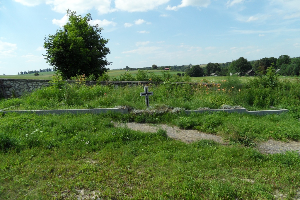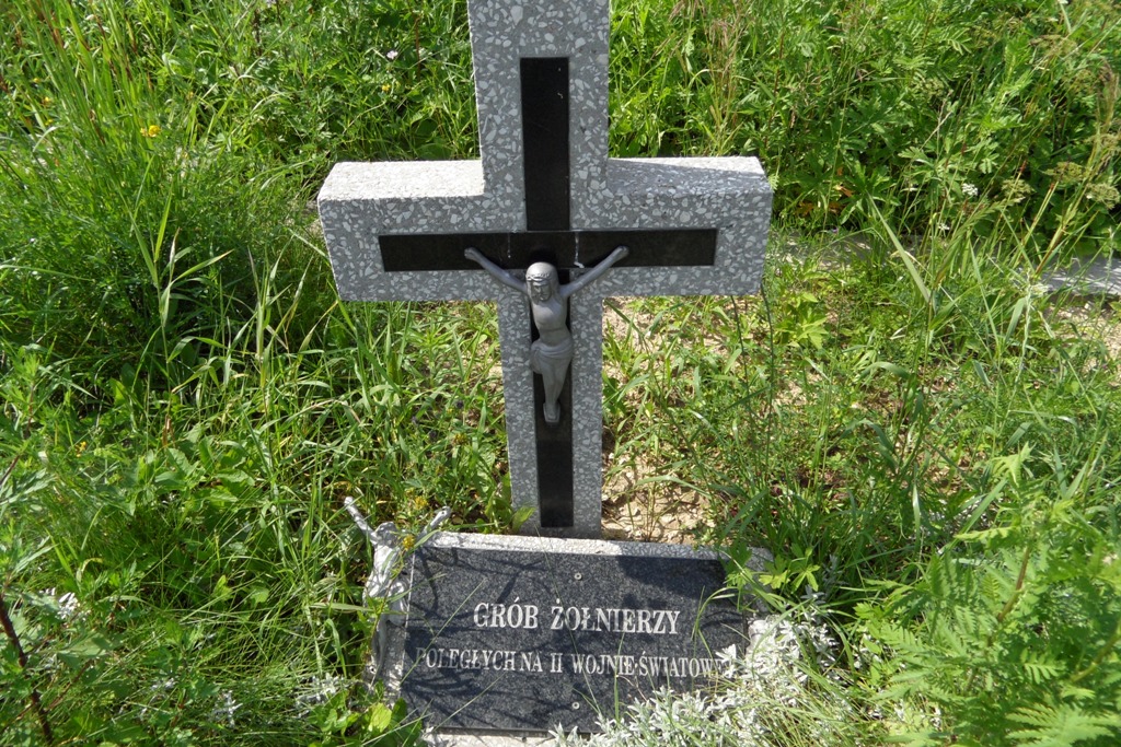 Mogiła ziemna w podłużnym, prostokątnym, betonowym obramowaniu. W środkowej części mogiły znajduje się niski lastrykowy krzyż z metalową pasyjką. U podstawy krzyża umieszczona jest tablica z napisem: „GRÓB POLEGŁYCH NA II WOJNIE ŚWIATOWEJ”.