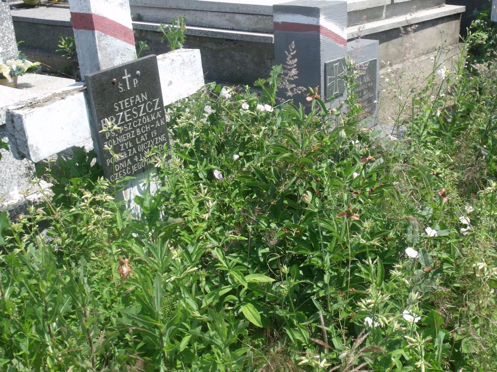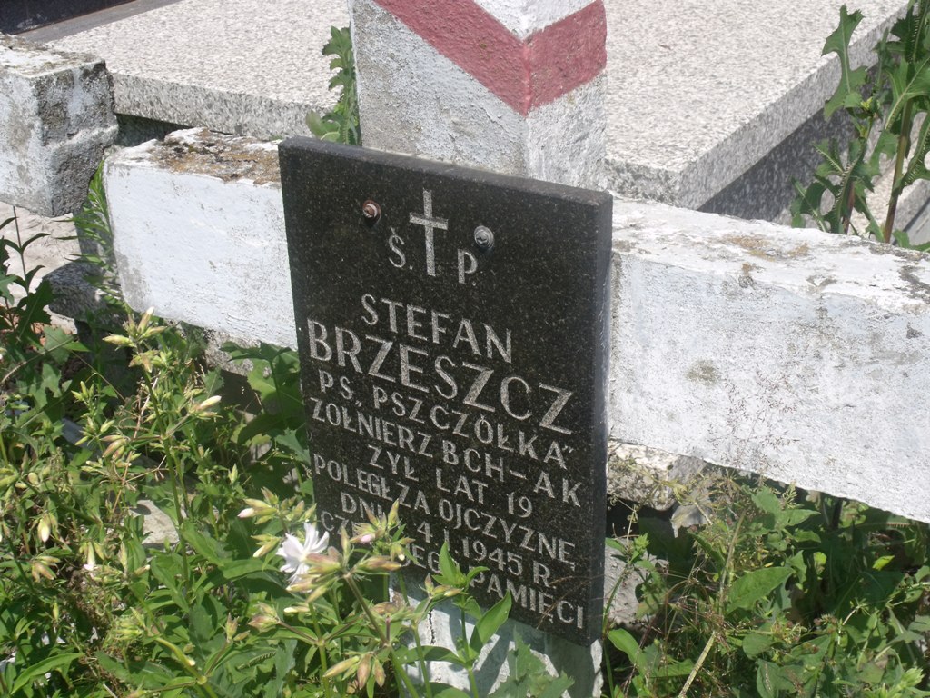 Mogiła ziemna w betonowym obramowaniu, u wezgłowia betonowy krzyż łaciński z czarną, prostokątną tablicą z napisem: „Ś.†P./ STEFAN/ BRZESZCZ/ PS. PSZCZÓŁKA/ ŻOŁNIERZ BCH-AK/ ŻYŁ LAT 19/ POLEGŁ ZA OJCZYZNĘ/ DNIA 4 I 1945/ CZEŚĆ JEGO PAMIĘCI”.