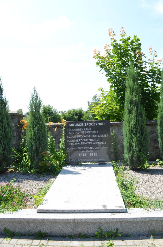Mogiła ziemna w szerokim, granitowym obramowaniu. Przez środek mogiły przełożona jest granitowa płyta. U jej wezgłowia znajduje się prostokątna stela z ciemnego kamienia z napisem: „MIEJSCE SPOCZYNKU/ 9 ŻOŁNIERZY ARMII/ AUSTRO-WĘGIERSKIEJ/ 5 ŻOŁNIERZY ARMII ROSYJSKIEJ/ 2 ŻOŁNIERZY NIEZNANEJ/ PRZYNALEŻNOŚCI ARMIJNEJ/ POLEGŁYCH W I WOJNIE ŚWIATOWEJ/ W LATACH/ 1914 – 1915/ NIECH SPOCZYWAJĄ W POKOJU”.