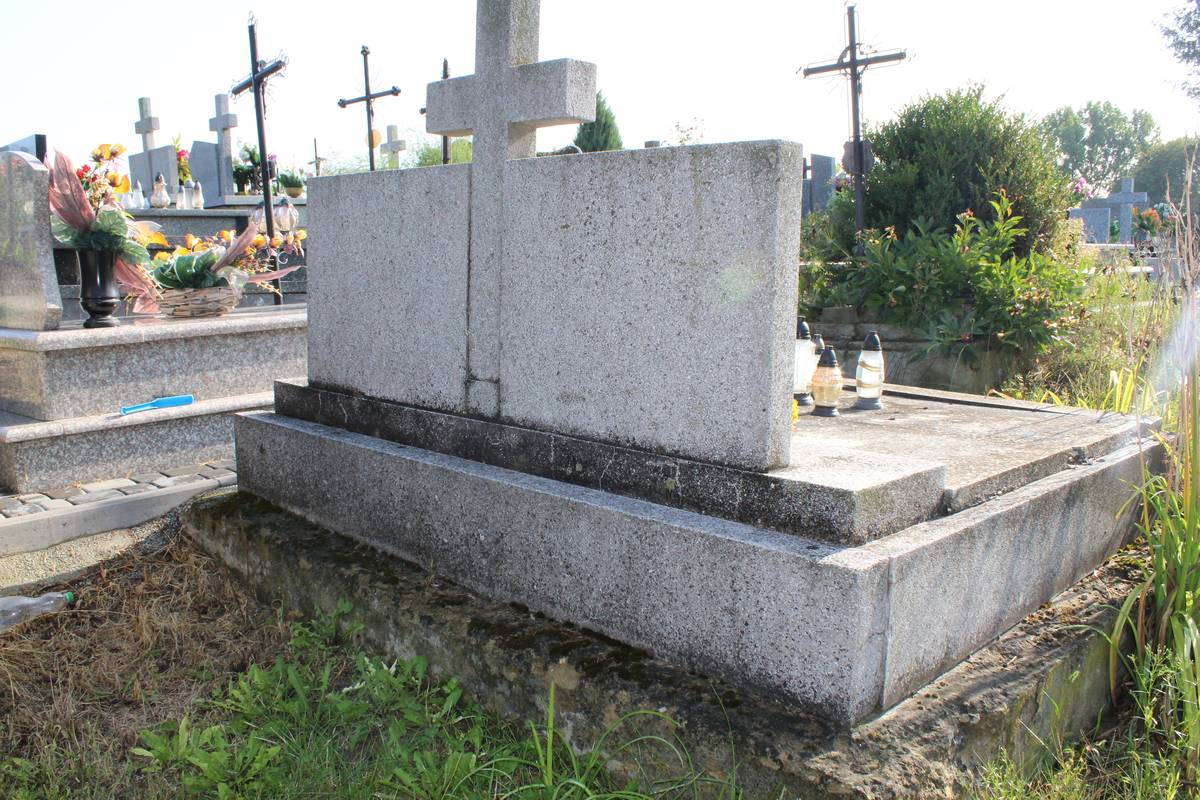 Szeroki lastrykowy nagrobek, u wezgłowia dwie lastrykowe stele i krzyż łaciński. Na stelach znajdują się dwie tablice z napisami: