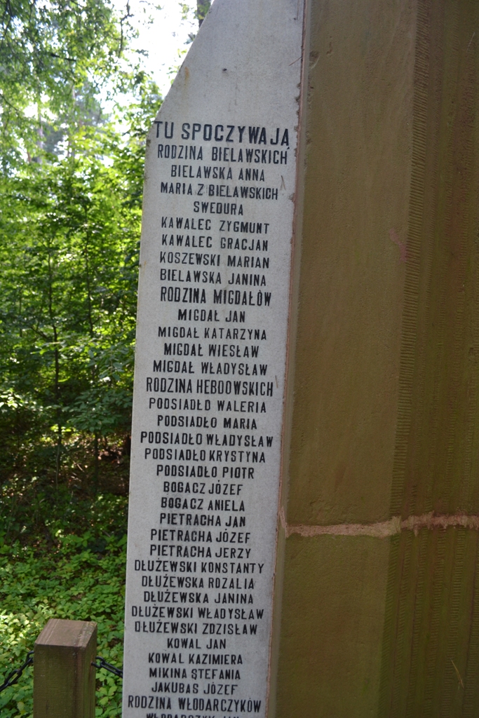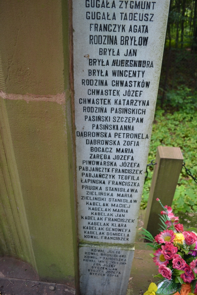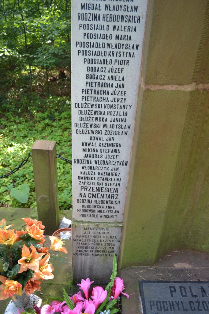 – „TU SPOCZYWAJĄ/ RODZINA BIELAWSKICH/ BIELAWSKA ANNA/ MARIA Z BIELAWSKICH/ SWEDURA/ KAWALEC ZYGMUNT/ KAWALEC GRACJAN/ KOSZEWSKI MARIAN/ BIELAWSKA JANINA/ RODZINA MIGDAŁÓW/ MIGDAŁ JAN/ MIGDAŁ KATARZYNA/ MIGDAŁ WIESŁAW/ MIGDAŁ WŁADYSŁAW/ RODZINA HEBDOWSKICH/ PODSIADŁO WALERIA/ PODSIADŁO MARIA/ PODSIADŁO WŁADYSŁAW/ PODSIADŁO KRYSTYNA/ BOGACZ JÓZEF/ BOGACZ ANIELA/ PIETRACHA JAN/ PIETRACHA JÓZEF/ PIETRACHA JERZY/ DŁUŻEWSKI KONSTANTY/ DŁUŻEWSKA ROZALIA/ DŁUŻEWSKA JANINA/ DŁUŻEWSKI WŁADYSŁAW/ DŁUŻEWSKI ZDZISŁAW/ KOWAL JAN/ KOWAL KAZIMIERA/ MIKINA STEFANIA/ JAKUBAS JÓZEF/ RODZINA WŁODARCZYKÓW/ WŁODARCZYK JAN/ KAŁUŻA KAZIMIERZ/ UMINSKA STANISŁAWA/ ZAPRZELSKI STEFAN/ PRZENIESIENI NA CMENTARZ/ RODZINA HEBDOWSKICH/ HEBDOWSKA ANNA/ HEBDOWSKI MIECZYSŁAW/ PODSIADŁO WINCENTY/ MAMCZYŃSKI/ ALEKSANDER/ MAMCZYŃSKI MICHAŁ/ MAMCZYŃSKA KAZIMIERA/ MAMCZYŃSKA ZOFIA/ KUBIŃSKI SZCZEPAN/ KUBIŃSKI BRONISŁAW/ KUBIŃSKI MAKSYMILIAN/”