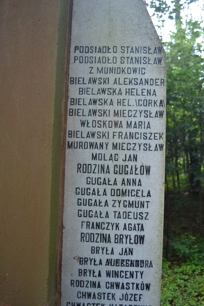 – „PODSIADŁO STANISŁAW/ PODSIADŁO STANISŁAW/ Z MUNIOKOWIC/ BIELAWSKI ALEKSANDER/ BIELAWSKA HELENA/ BIELAWSKA HEL. \CÓRKA\/ BIELAWSKI MIECZYSŁAW/ WŁOSKOWA MARIA/ BIELAWSKI FRANCISZEK/ MUROWANY MIECZYSŁAW/ MOLĄG JAN/ RODZINA GUGAŁÓW/ GUGAŁA ANNA/ GUGAŁA DOMICELA/ GUGAŁA ZYGMUNT/ GUGAŁA TADEUSZ/ FRANCZYK AGATA/ RODZINA BRYŁÓW/ BRYŁA JAN/ BRYŁA ALEKSANDRA/ BRYŁA WINCENTY/ RODZINA CHWASTKÓW/ CHWASTEK JÓZEF/ CHWASTEK KATARZYNA/ RODZINA PASIŃSKICH/ PASIŃSKI SZCZEPAN/ PASIŃSKA ANNA/ DĄBROWSKA PETRONELA/ DĄBROWSKA ZOFIA/ BOGACZ MARIA/ ZARĘBA JOZEFA/ PIWOWARSKA JÓZEFA/ PABJAŃCZYK FRANCISZEK/ PABJAŃCZYK TEOFILA/ ŁAPIŃSKA FRANCISZKA/ PRUSKA STANISŁAWA/ ZIELIŃSKA MARIA/ ZIELIŃSKI STANISŁAW/ KABELAK MACIEJ/ KABELAK MARIA/ KABELAK JAN/ KABELAK FRANCISZEK/ KABELAK KLARA/ KABELAK GENOWEFA/ KLABELAK DOMICELA/ KOWAL FRANCISZEK/ KOWAL JULIA/ KOWAL BRONISŁAWA/ KOWAL FRANCISZKA/ KOWAL MIECZYSŁAWA/ ZOŃ JÓZEF/ BYCZEK JAN/ BYCZEK JÓZEFA/ BYCZEK ZOFIA”.