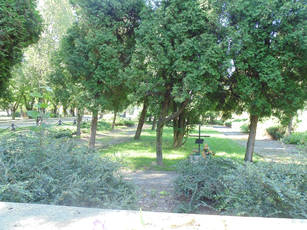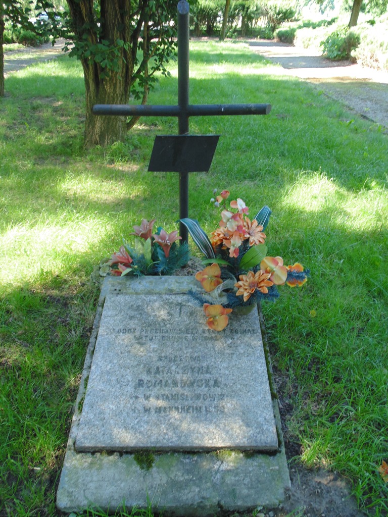 Wnętrze urządzone jest w formie pasu zieleni obsadzonego bukszpanem, biegnącego wzdłuż ogrodzenia oraz skweru na planie prostokąta, oddzielonych od siebie utwardzoną alejką. Na środkowym skwerze, obsadzonym trawą i żywotnikiem, umieszczona jest granitowa płyta nagrobna z metalowym krzyżem u wezgłowia i napisem: „†/ OBOK PROCHÓW MĘŻA, KTÓRY ZGINĄŁ/ W TUT. OBOZIE W 1942/ SPOCZYWA/ KATARZYNA/ ROMANOWSKA/* W STANISŁAWOWIE/ † MANNHEIM 1979”.