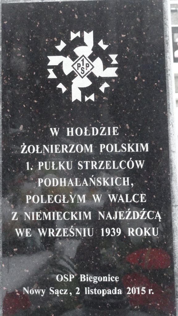 Na mogile znajduje się granitowy nagrobek z obeliskiem u wezgłowia, ustawiony na tarasie wyłożonym kostką betonową. Najbliższe otoczenie mogiły ogrodzone jest z trzech stron granitowymi słupkami, połączonymi żelaznym łańcuchem. Na frontowej ścianie nagrobka umieszczona jest prostokątna, tablica z ciemnego kamienia: „POMNIK UFUNDOWANY/ PRZEZ DRUHÓW Z BIEGONIC/ Z OKAZJI 125 ROCZNICY POWSTANIA/ OCHOTNICZEJ STRAŻY POŻARNEJ/ BIEGONICE, SIERPIEŃ 2014”. Na frontowej ścianie obelisku znajduje się metalowa pasyjka oraz czarna tablica z wyrytą odznaką 1 Pułku Strzelców Podhalańskich oraz napisem: „W HOŁDZIE/ ŻOŁNIERZOM POLSKIM/ 1. PUŁKU STRZELCÓW/ PODHALAŃSKICH/ POLEGŁYM W WALCE/ Z NIEMIECKIM NAJEŹDŹCĄ/ WE WRZEŚNIU 1939 ROKU/ OSP Biegonice/ Nowy Sącz, 2 listopada 2015 r.”