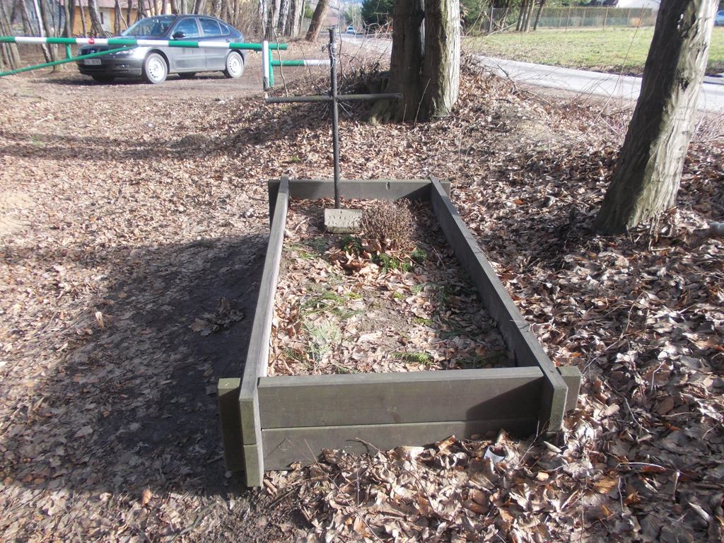 Mogiła ziemna, obramowana deskami, u wezgłowia krzyż z metalowych rur i niewielka betonowa płyta z wyrytymi datą „23 I 1945” i napisem „Berlin”.