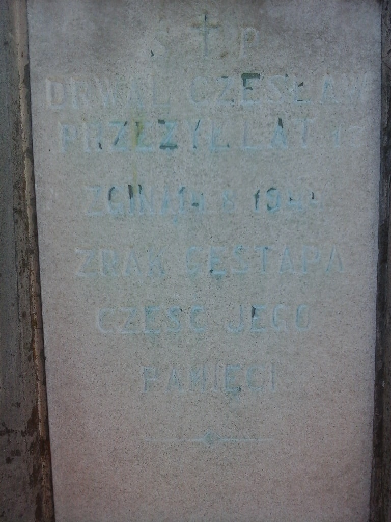 Mogiła nakryta kamienną płytą, u wezgłowia pomnik nagrobny w formie trójstopniowego, zakończonego dwuspadowo postumentu, zwieńczonego krzyżem łacińskim z pasyjką. Na frontowej ścianie pomnika umieszczony jest medalion ze zdjęciem i tablica z jasnego kamienia z inskrypcją: „Ś.✝P./DRWAL CZESŁAW/ PRZEŻYŁ LAT 18/ ZGINĄŁ 4 8 1944/ ZRĄK GESTAPA/ CZEŚĆ JEGO PAMIĘCI”.