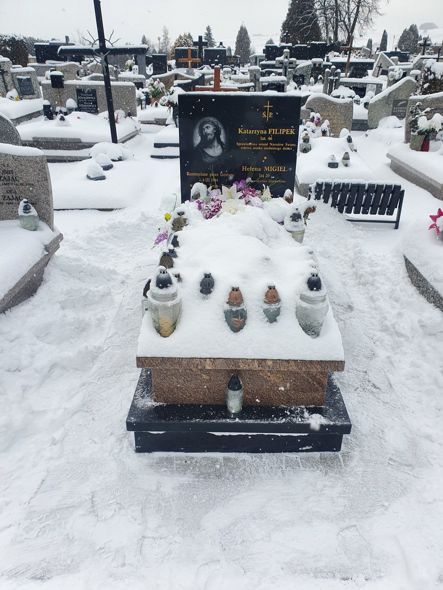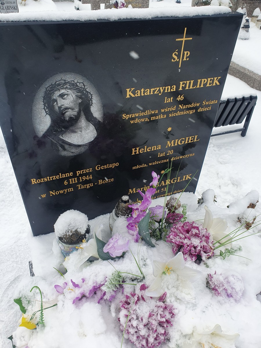 Na mogile znajduje się dwustopniowy nagrobek o wymiarach 1 x 2 m. U jego wezgłowia umieszczona jest prostokątna stela z czarnego kamienia z wyobrażeniem głowy Chrystusa w koronie cierniowej oraz złoconymi napisami: Rozstrzelane przez Gestapo/ 6 III 1944/ w Nowym Targu – Borze/ Ś.†P./ Katarzyna FILIPEK/ lat 46/ Sprawiedliwa wśród Narodów Świata/ wdowa, matka siedmiorga dzieci/ * / Helena MIGIEL/ lat 20/ młoda, waleczna dziewczyna/ * Maria BARGLIK/ lat 51/ żona, matka czworga dzieci”.