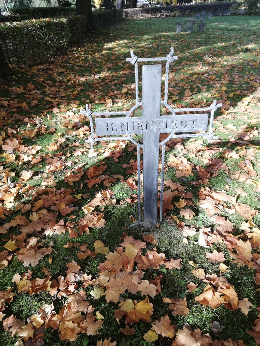 – krzyż płaskownika ze zdobieniami z metalowych prętów z napisem „H. NIENTIEDT”,’