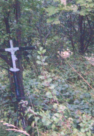 Mogiła ziemna z czarnym, metalowym krzyżem, opartym o drzewo, położona na tzw. Dziale Jachowskim.