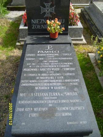 Płyta granitowa z inskrypcją, upamiętniającą oficerów Armii Krajowej i Batalionów Chłopskich z gminy Brzeźnica i Skawina. Na pionowej tablicy nagrobnej znajduje się wizerunek Krzyża Virtuti Militari i napis: „NIEZNANEMU ŻOŁNIERZOWI”.