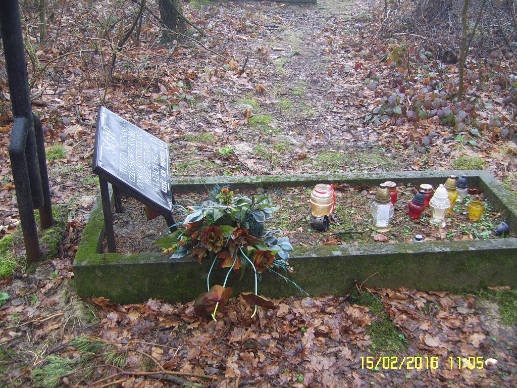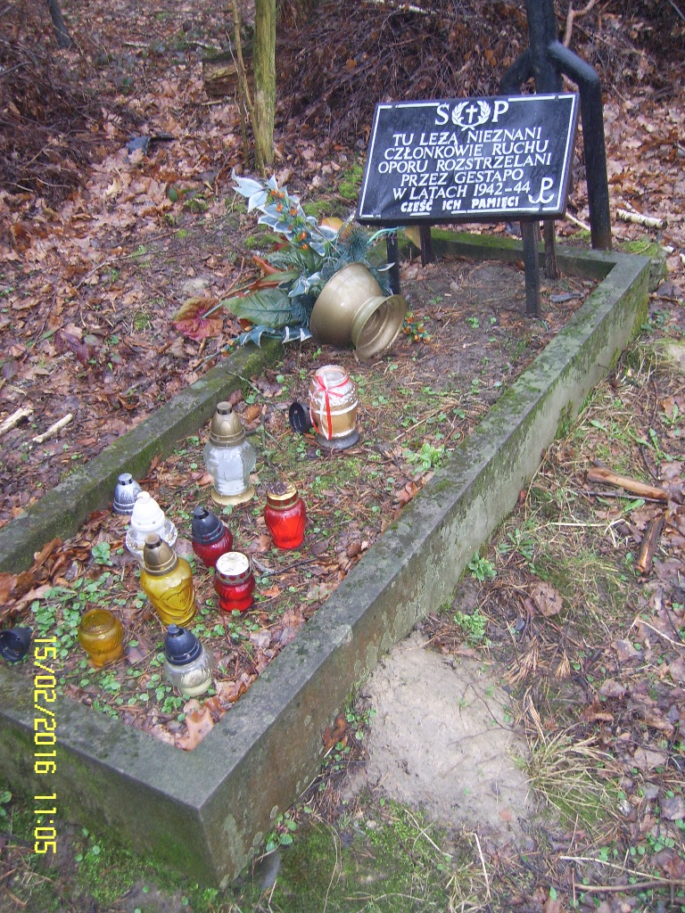 Mogiła ziemna w prostokątnym, betonowym obramowaniu, u wezgłowia krzyż z metalowych rur z glorią złożoną z trzech okręgów przeciętych pofalowanymi prętami. U podstawy krzyża umieszczona jest metalowa tablica z symbolem Polski Walczącej i napisem: „Ś ✝ P/ TU LEŻĄ NIEZNANI/ CZŁONKOWIE/ RUCHU OPORU ROZSTRZELANI/ PRZEZ GESTAPO/ W LATACH 1942-1944/ CZEŚĆ ICH PAMIĘCI/”. W odległości kilku metrów znajduje się druga mogiła, urządzona w podobny sposób.