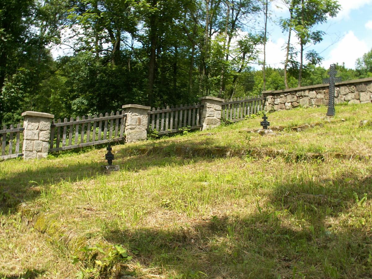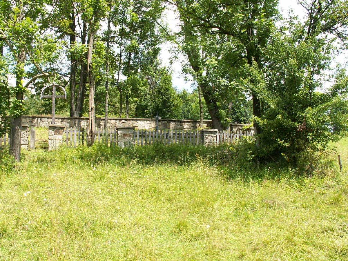 Cmentarz zalożony jest na planie zbliżonym do prostokąta i otoczony od strony północnej i częściowo wschodniej murem kamiennym, a z pozostałych stron – kamiennymi słupami połączonymi drewnianym płotem. Znajdujące się od południa wejście zamyka drewniana, jednoskrzydłowa furtka. Głównym elementem cmentarza jest wysoki, drewniany krzyż łaciński, z półkolistym zadaszeniem pokrytym ząbkowaną blachą.
