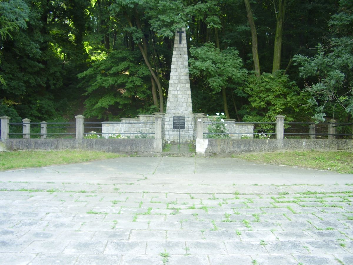 Po obu stronach pomnika znajdują się krótkie, opadające uskokowo odcinki kamiennego muru, na których umieszczone są tablice z nazwiskami pomordowanych.