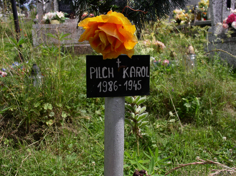 Mogiła ziemna z metalowym krzyżem i tabliczką z napisem memoratywnym. Pochowany tu Karol Pilch został zastrzelony przez żołnierzy radzieckich w lutym 1945 r.