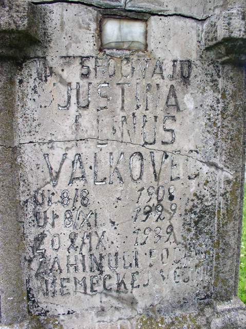 „TU SPOCIVAJU// JUSTINA// I LINUS// VALKOVEC// Ur. 8/VIII. 1908.//Ur. 8/XI.1929.//ZO 2/9.1939.// ZAHINULI POCIAS// NIEMECKIEJ VOJNI//"
